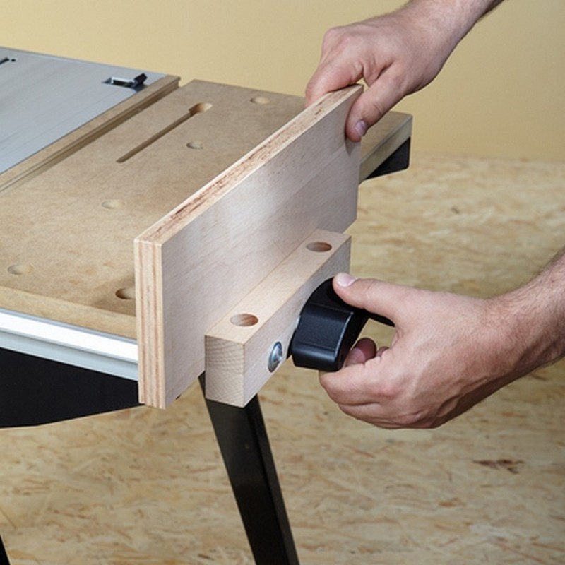 Wolfcraft'ın mobil çalışma tezgahı 6909000 Master Work 1600 Çalışma Tezgahı, çalışma tezgahı olarak kullanımın yanı sıra sabit cihazlar için çok sayıda takma ve bağlama olanağını da taşımaktadır. Dengeli ve dayanıklı alüminyum şasisi katlanabilen 6909000 Master Work 1600 Çalışma Tezgahı, istenen yere kolayca taşınabilir ve fazla yer kaplamayacak şekilde saklanabilir. 120 kg'a kadar yük taşıma kapasitesine sahip olan, 22 mm kalınlığında MDF'den imal edilmiş 1035 x 695 mm büyüklüğündeki çalışma alanı ile neredeyse her proje için uygundur. Yükseklik ayarlı ayağı, düz olmayan zeminlerde dahi tezgahın güvenli bir şekilde sabitlenmesini mümkün kılmaktadır. Entegre edilmiş 20 mm'lik deliklere sıkıştırma çeneleri, mengeneler ve başka bağlama ekipmanları esnek bir şekilde yerleştirilebilir. Özel uzun delikler ise tezgah üzerinde wolfcraft'ın tek elle kullanılan mengenelerinin kullanılmasını mümkün kılar. Delik ölçüsü sayesinde mengeneler istenen yöne rahatça döndürülebilir. Büyük ebatlı iş parçalarını tezgah profiline kuvvetli bir şekilde sabitlemek için 2 büyük ve 2 sıkıştırma bloğu kullanılabilir. Bunlar, tezgahın altındaki yerleşim yüzeyini genişleterek mengenelerin en iyi şekilde kullanılmasını mümkün kılar. Ayrıca bu sıkıştırma blokları, tezgahı katlı halde bağımsız olarak sakladığınızda yerleşim yüzeyleri olarak görev yapar. 4 küçük sıkıştırma çenesi, iş parçalarını yerleştirirken durdurucu olarak kullanılır. Bunlar artık gerek kalmadığında sıkıştırma bloklarının içindeki öngörülen tutucularda saklanabilir. Gönyeburun ve gönye testerenizi veya wolfcraft matkap sehpanızı (Ürün No. 5027000) sabit olarak kullanabilmeniz için çalışma plakasında sabitleme oyukları ve delikler yer almaktadır. Uygun sabitleme malzemeleri de teslimat kapsamına dahildir. Tek bir ürünle binanızdaki ve evinizdeki birçok işi güvenli ve etkili bir şekilde yapabilirsiniz.