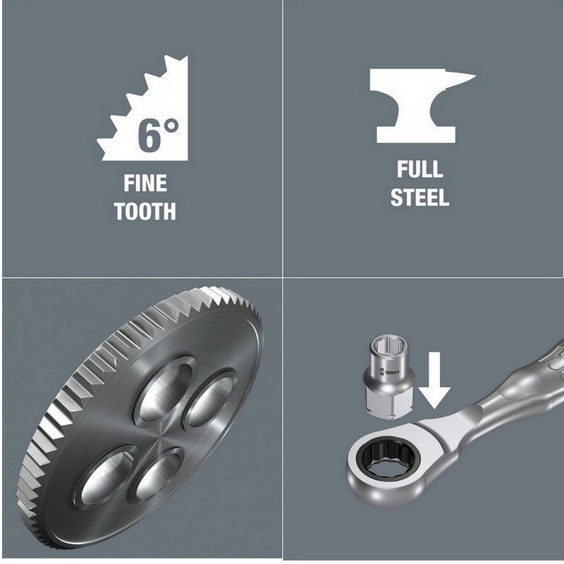 Wera 8005 Zyklop Mini 2 Cırcır 05003660001 bir cırcırdan beklenen tüm fonksiyonları yerine getir. Normal cırcırlardan tek farkı boyutu. 6 derecelik çalışma açısına sahiptir. Çalışılması zor ve dar alanlarda Wera Zyklop mini cırcır büyük kolaylık sağlamaktadır. 65 Nm gücü dayanıklı metal yapısı olan Wera 8005 Zyklop Mini 2 Cırcır 05003660001 mandallı yön mekanizmasına sahiptir. Mandallı yön mekanizması sayesinde cırcırı sağ veya sol yönde kullanmak mümkündür. Zyklop Mini 2 sürücüsüz cırcırı sayesinde FA altıgen lokmalar ile uyumlu olup, lokmaları takıp çıkarmak oldukça kolaydır. Metalden yapılmış olan sapı el ergonomisine göre tasarlandığından rahat bir tutuşu vardır.