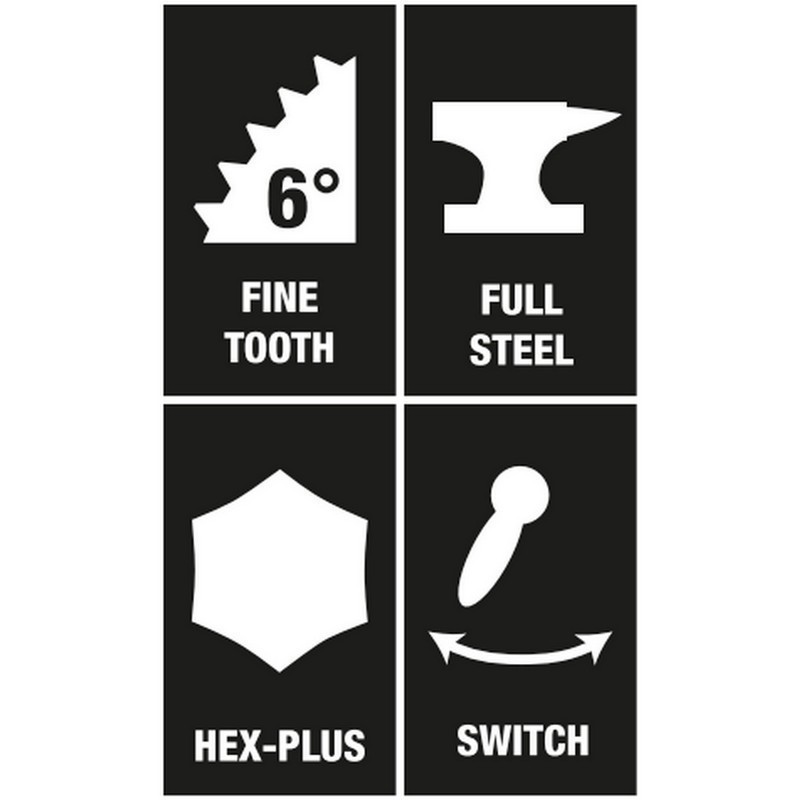 - 6° çalışma açılı cırcır mekanizması