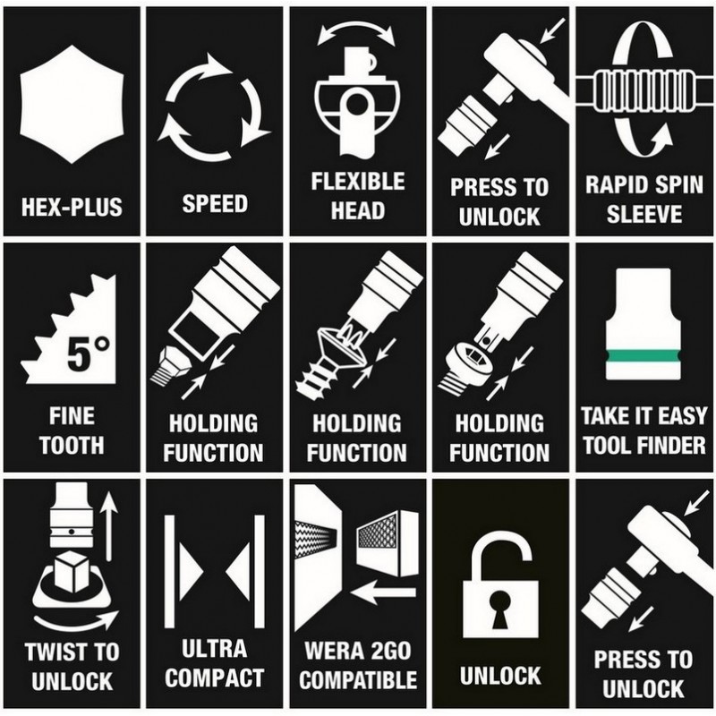 Wera 8100 SA ALL Zyklop Cırcır 1/4" Lokma Bits Seti 05003755001 oynar başlıklı cırcırlı lokma bits takımıdır. Cırcır 1/4" kare lokma tutucu sürücü özelliğe sahiptir. Wera oynar başlıklı Zyklop cırcır 72 ince dişe yani 5°'lik çalışma açısı sağlar. Cırcır kafası serbestçe döner ve her iki tarafta bulunan sürgülü anahtar kullanılarak herhangi bir konuma kilitlenebilir. Geliştirilmiş el açıklığı ile çok dar ve erişilmesi zor alanlarda bile rahatça çalışmak mümkündür. Sağa ve sola 0°, 15° ve 90° önceden tanımlanmış kilitleme konumları, herhangi bir kayma olmadan güvenli çalışmayı sağlar. Wera 8100 SA ALL Zyklop Cırcır 1/4" Lokma Bits Seti 05003755001 0° konumunda geleneksel bir tornavida olarak kullanılabilir. Kraftform sapının olağanüstü tasarımı ele mükemmel bir şekilde oturur, kabarcıklar veya nasır gibi el yaralanmalarını önler. Sap için kullanılan sert malzemeler, herhangi bir cilt "yapışması" tehlikesi olmadan elin hızlı ve kolay yeniden konumlandırılmasını sağlar. Wera 8100 SA ALL Zyklop Cırcır 1/4" Lokma Bits Seti 05003755001 torkun düşük kayıplı aktarımını sağlar.