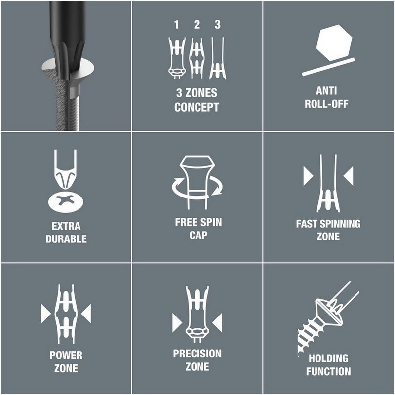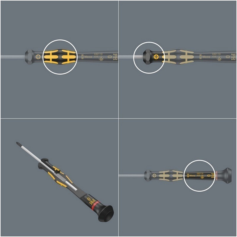 Wera 1567 HF ESD Torx Mikro Tornavida'nın holding (HF) yani tutma özelliği sayesinde vidalar tornavidan düşmez, bu sayede hassas cihazlarda vida kaybolması veya vidanın cihaz içine düşmesi engellenmiş olur.